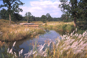 लेंडस्केप का विवरण : कान्हा मध्य भारतीय उच्च-भूमि में स्थित है जो मुख्य प्रायद्वीपीय भारत के विस्तृत पठार का एक भाग है। मैकल पर्वत माला कान्हा टाईगर रिजर्व की सबसे प्रमुख भू-आकृति है जो कि उत्तर-दक्षिण दिशा में जाती है। रिजर्व की पूर्वी सीमा पर स्थित यह पर्वत माला नर्मदा और महानदी के जलग्रहण क्षेत्रों के बीच की विभाजन रेखा है। भौगोलिक रूप से टाईगर रिजर्व पूर्व और उत्तर-पूर्व में हलोन घाटी तथा दक्षिण-पश्चिम एवं पश्चिम में बंजर घाटी से मिलकर बना है। चपटे शिखर वाली पहाडियां, जिन्हें स्थानीय तौर पर दादर कहा जाता है, लुढकती ढलानें, घाटियाँ एवं विराट घास मैदान लेंडस्केप की मुख्य विशेषताएं है जिनमें साल, मिश्रित वनों तथा घास मैदानों के विभिन्न वानस्पतिक आच्छादन समाहित है।